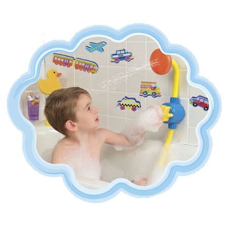 I agree with the other reviewer that this is not the greatest toy. In addition to the end that is supposed to stay in the water but floats instead, the 2 suction cups meant to hold the toy to the bath tub or wall are too small to hold it steady, so it slips easily out of place. It is not that easy for small hands to pump and to get water coming out of the shower head you have to pump it at least 20 times to prime it before the shower starts to flow. Needless to say, by that time, the toddler is pretty much bored with pumping.